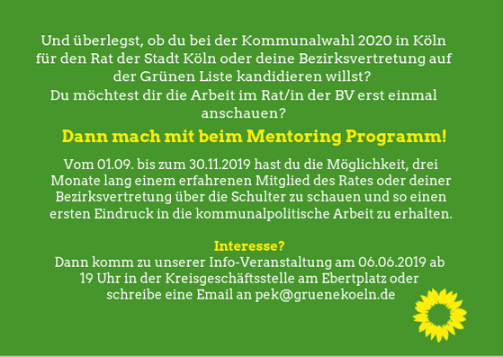 Du hast Lust noch mehr zu gestalten? Du fragst dich was eigentlich ein*e Beisitzer*in oder ein*e Ortsverbandsprecher*in macht? Welche Schritte in die Bezirksvertretung führen oder was Ehrenamtlichen mit Mandat Freude daran macht? Dann melde dich bei uns! Wir stellen dir eine*n persönliche*n Ansprechpartner*in zur Verfügung, um dir Hintergründe zu erläutern, Fragen zu beantworten und dich generell ein wenig an die Hand zu nehmen. Melde dich gerne unter buddyprogramm@gruenekoeln.de