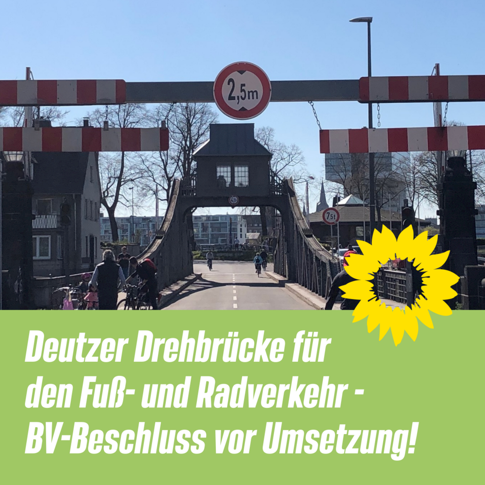 Dennoch wurde Sperrung der Deutzer Drehbrücke für Kraftfahrzeuge trotz eines weiteren Beschlusses der Grünen in der Bezirksvertretung Innenstadt 2019 bisher nicht umgesetzt.