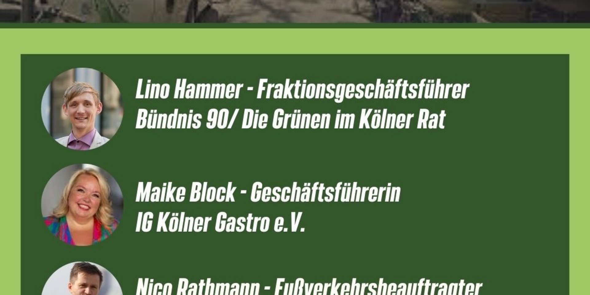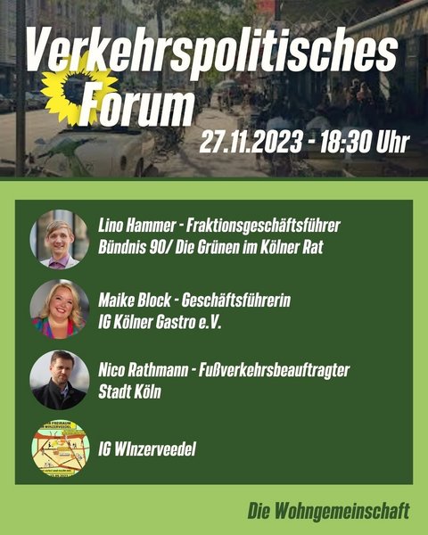 Wir freuen uns auf Lino Hammer, unseren Fraktionsgeschäftsführer der Kölner Grünen im Rat. Maike Block, Geschäftsführerin der IG Kölner Gastro e.V.. Nico Rathmann, Fußverkehrsbeauftragter der Stadt Köln und auf Vertreterinnen des IG Winzerveedels.