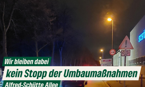 Entgegen des anderslautenden Antrags auf Wunsch der CDU zur Sitzung der Bezirksvertretung Porz am 01.02.2024/Maßnahmen auf der Alfred-Schütte-Allee wird ein Stopp der Umbaumaßnahmen zugunsten einer Sperrung am Wochenende von den Porzer GRÜNEN nicht mitgetragen. Er findet auch keine Zustimmung der GRÜNEN in der Bezirksvertretung. Ebenfalls wird dieser Antrag von Seiten der GRÜNEN im Verkehrsausschuss des Kölner Stadtrates nicht unterstützt.