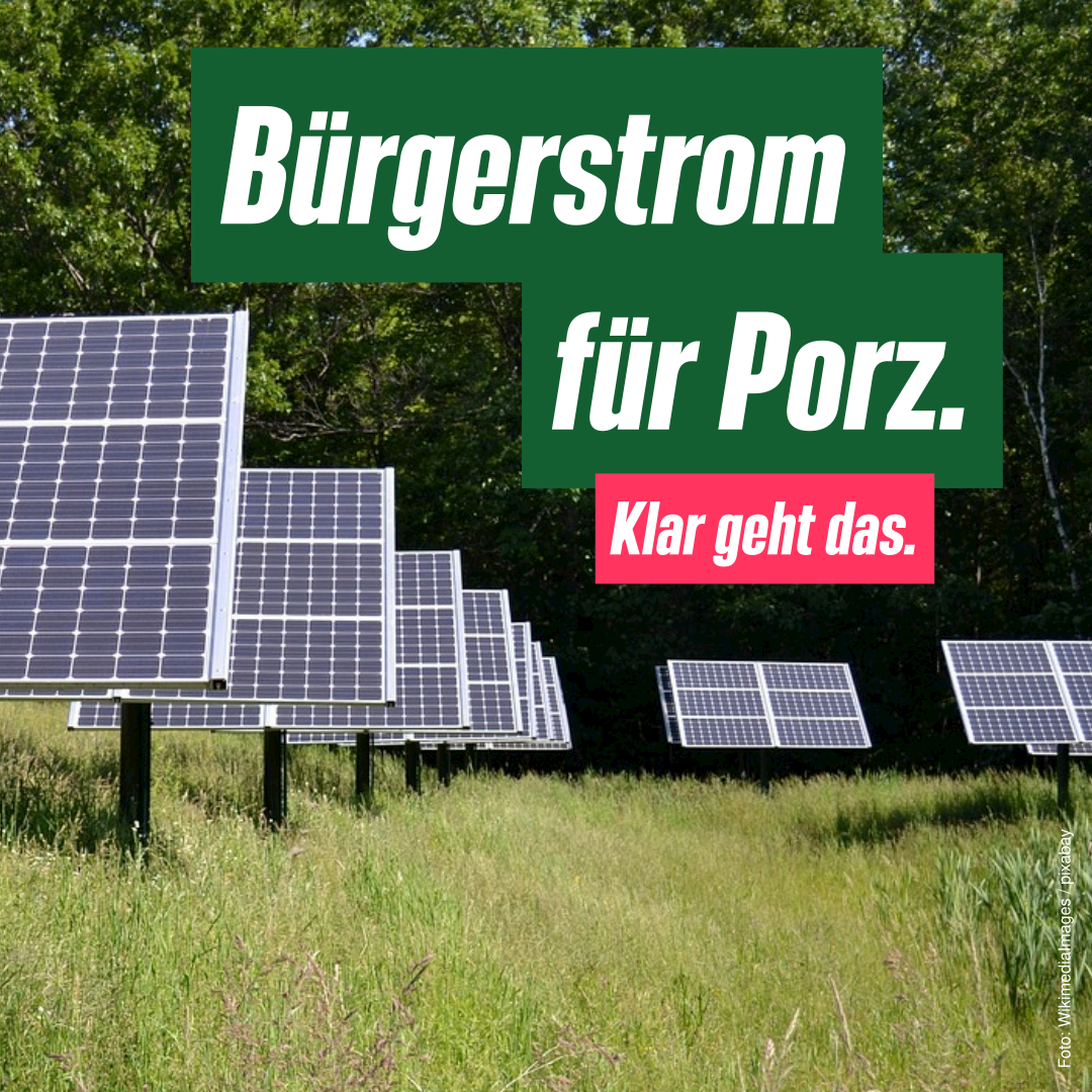Deshalb haben wir uns in einem (einstimmig beschlossenen) Antrag in der letzten Sitzung der Bezirksvertretung zunächst auf Solarenergie für Bürgerstrom konzentriert. Wir haben Stadtrat und -verwaltung gebeten, Bürgerstromerzeugung weitgehend zu unterstützen und speziell im Porzer Süden diesbezüglich Flächen zu untersuchen. Eine Kombination z.B. mit landwirtschaftlicher Nutzung ist derzeit schon vielfach praktiziert z.B. durch solarnachgeführte Aufständerungen.