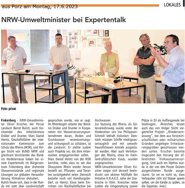 Am 10.6.23 hatten wir zum Expertentalk eingeladen mit NRW Umweltminister Oliver Krischer, Bernd Bulich (Porzer Landwirt, Vors. Arbeitskreis Drüber&Drunter), Marc Daniel Heintz (Geschäftsführer Intern. Kommission zum Schutz des Rhein) und Holger Sticht (Bündnis Heideterrasse, BUND NRW). Bulich stieß auf großes Interesse mit der Kooperation Land-/Wasserwirtschaft zum Schutz von Boden und Grundwasser. Das Ökosystem Rhein hat sich lt. Marc Daniel Heintz etwas erholt, es ist aber noch viel zu tun. Oliver Krischer freute sich darüber, dass in den Schwammstadtprojekten der Kölner StEB in Eil Landesmittel bestens angelegt wurden. Das Projekt zur Wiedervernässung ehemaliger Moorgebiete stellte Holger Sticht vor, wo die Bergische Heideterrasse an ihrer westlichen Seite mit potentiellen Gebieten von Dünnwald über den Königsforst bis nach Lind reicht.