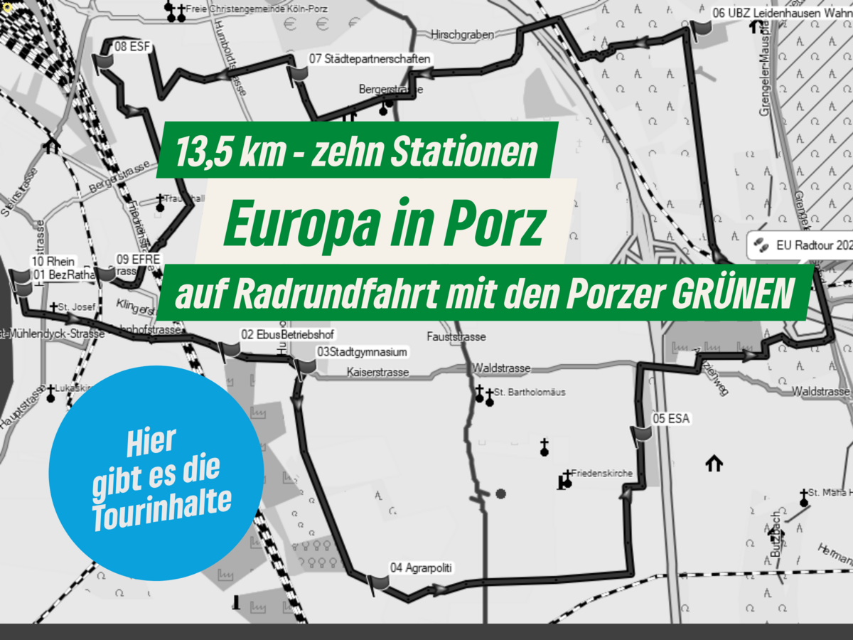 Im Mai 2024 haben wir Europa in unserem Bezirk Porz erradelt. Am Bezirksrathaus informierten wir darüber, wie EU-Beschlüsse bis zur Umsetzung durch die Mitgliedsstaaten z.B. beim EU-Behindertenausweis ablaufen. Am Stadtgymnasium erörterten wir das EU-Programm ERASMUS, an welchem diese Schule teilnimmt. Im UBZ Leidenhausen berichtete Geschäftsführer Robert Schallehn u.a. über die EU-Wasserrahmenrichtlinie und die 1992 einstimmig beschlossene EU-Fauna-Flora-Habitat-Richtlinie. Die ESA erhebt mittels Satelliten Langzeitdaten zu Klimaveränderungen als Basis für internationale Aktivitäten. An der Hazebrouckstraße gab es Auskunft über den Beitrag des Städtepartnerschaftsvereins zur Völkerverständigung. Die Rundfahrt führte durch's „Europa“viertel in Finkenberg mit Informationen über den Europäischen Sozialfonds ESF, aus dem Sozialtrainings in Schulen oder Hilfsprogramme wie „Plan 27“ gefördert werden. Bzgl. Stadtentwicklung kam der Europäischen Fonds für regionale Entwicklung EFRE zur Sprache. Wie Mobilitätswende auch Antriebswende beinhaltet, war am E-Busbetriebshof zu sehen. Aufmerksamkeit erhielten unterwegs Flächen regionaler Landwirte, die sich für Boden- und Gewässerschutz einsetzen, für die wir in der EU agrarpolitisch größere Unterstützung als für die Agrarindustrie wollen. Das Europäische Gewässer Rhein bildete den Abschluss mit Informationen über die täglich vorbeifließende Müllmenge und Initiativen, deren Verursacher besser zur Verantwortung zu ziehen.